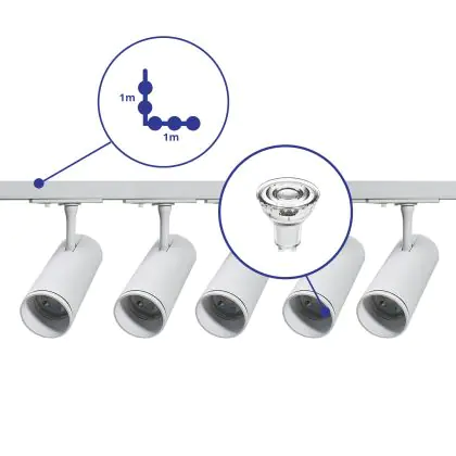 Beschrijving Complete Set 1-Fase Rail L 1 x 1 Meter Wit | incl. 5x Spot + GU10 2700K 3W Dimbaar + 1 x 1 Meter Eindkap, Voedingsconnector en L -Verbindingsstuk