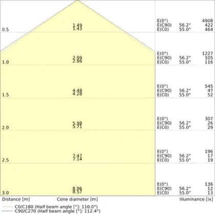 De lichtopbrengst (Lumen), geeft weer hoe krachtig het uitgestraalde licht is. Dit is belangrijk om te weten om de juiste sfeer te creëren. 0 tot 400 Lumen is bij uitstek geschikt voor accent- of sfeerverlichting. Een hoger aantal Lumen is, afhankelijk van de grootte van de ruimte, beter geschikt als ondersteunende- of basisverlichting. Heb je plafonds hoger dan 4 meter, dan is een lichtopbrengst van minimaal 8000lm aan te raden indien heldere verliching gewenst is (vb. in werkomgevingen).