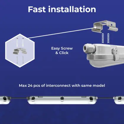 Een belangrijk element van LED montagebalken is de IP waarde. Dit geeft aan in hoeverre een product stof- en waterdicht is. IP44 betekent dat een armatuur spatwaterdicht is en vanaf IP65 is een LED armatuur volledig stof- en waterdicht. De IP waarde van deze LED montagebalk is: IP65 - Stof- en Waterdicht. Wanneer een LED montagebalk volledig waterdicht is, kun je deze perfect gebruiken voor ruimtes waar het vochtig kan worden of neerslag valt, zoals stallen, loodsen, kelders, parkeergarages en buitenplaatsen. Wil je meer weten over de IP waarde? Klik dan hier om onze blog te lezen.